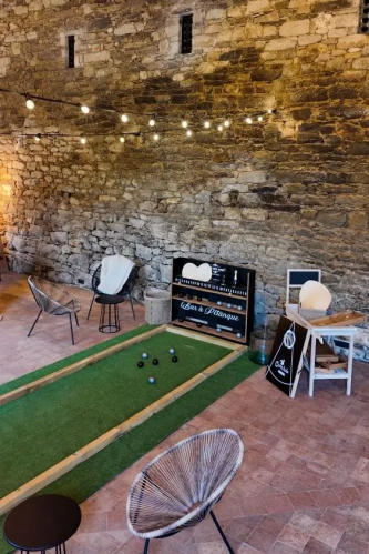 Exemples de matériel à louer : mange-debout, tabourets, fauteuils, sièges, tables, comptoirs, guirlandes lumineuses, luminaires, candy bar, plantes, jeux de Mölkky, pétanque, corhnole, jeux bretons, décoration et art de la table, bornes photo, etc.