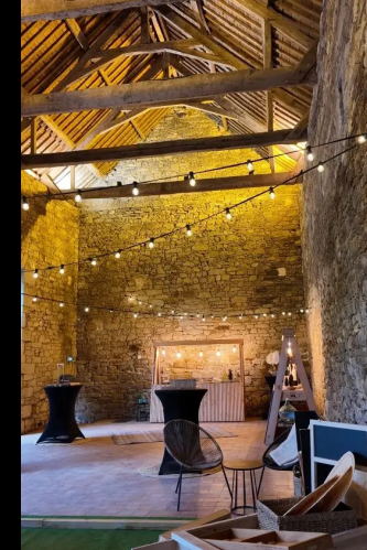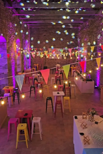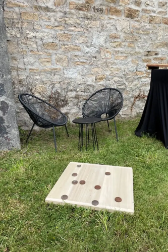 Exemples de matériel à louer : mange-debout, tabourets, fauteuils, sièges, tables, comptoirs, guirlandes lumineuses, luminaires, candy bar, plantes, jeux de Mölkky, pétanque, corhnole, jeux bretons, décoration et art de la table, bornes photo, etc.